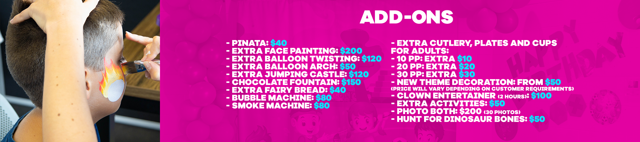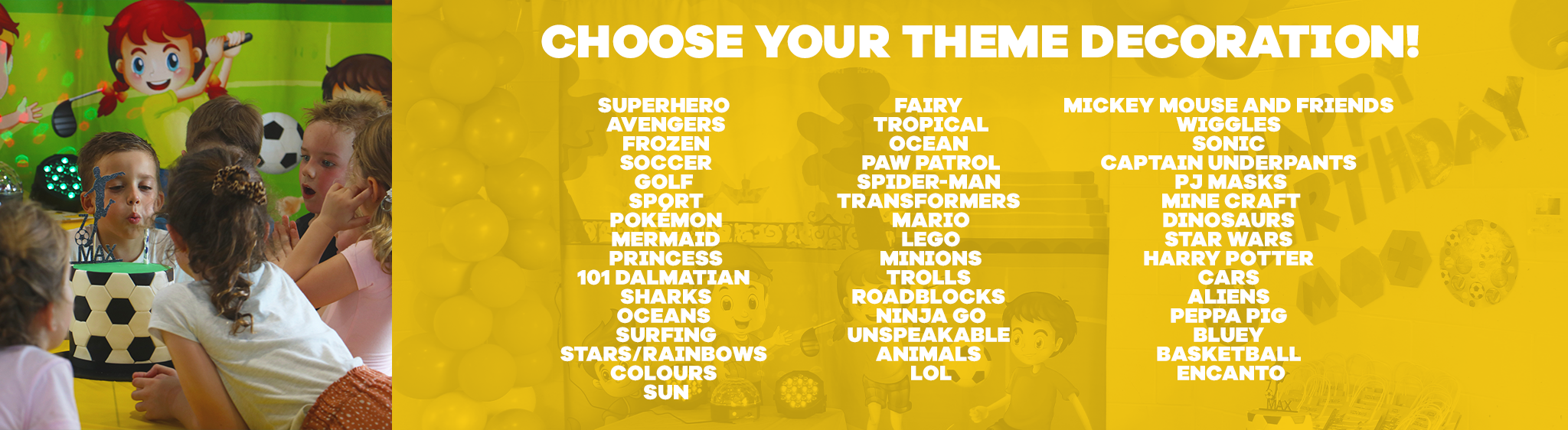 2 HOURS OF PARTY SELECT 2 ACTIVITIES. CHOICE OF THEME. PARTY HOST. PARTY BAGS.